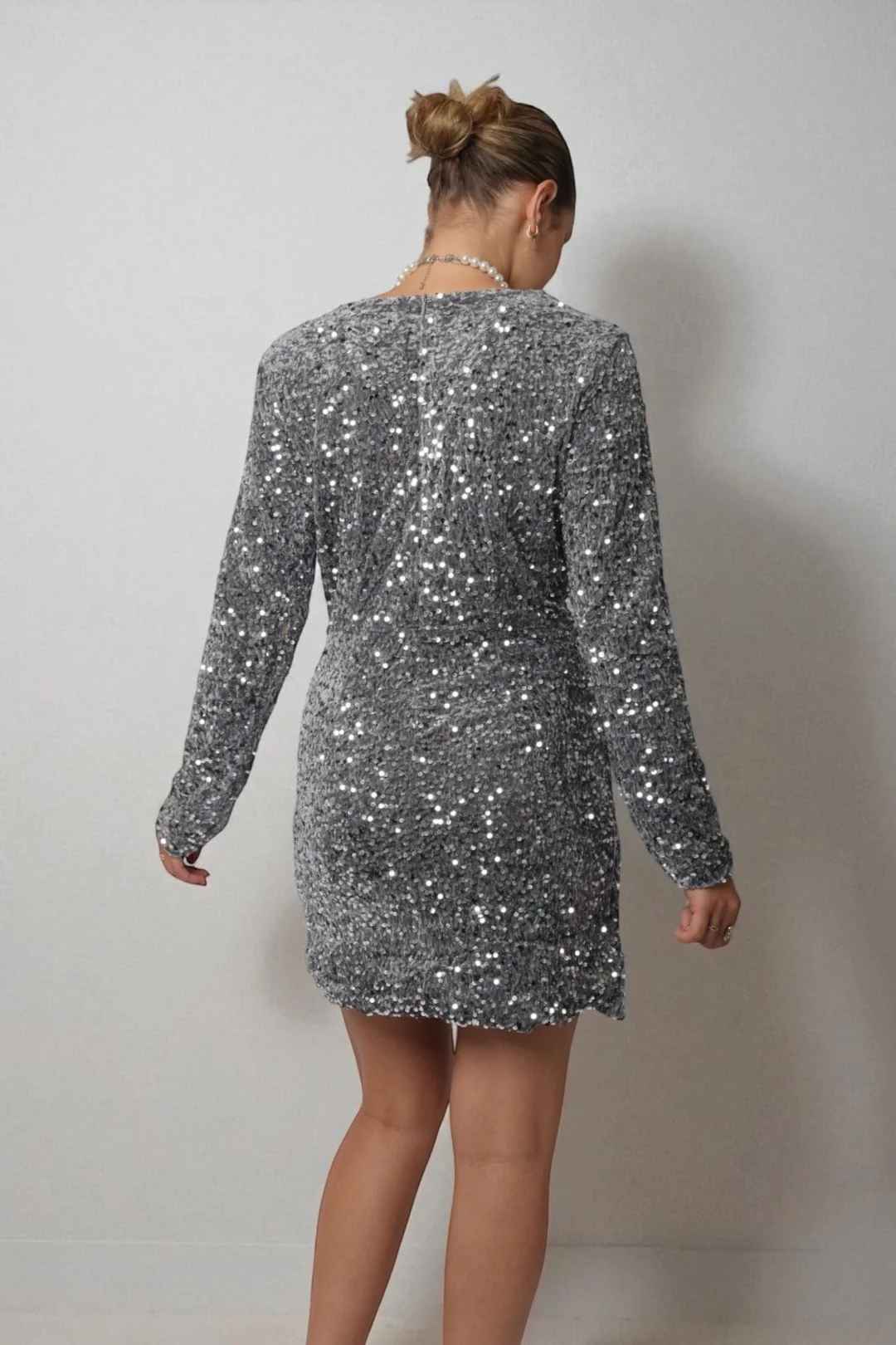 🪩 Cette robe gris à sequins est parfaite pour briller lors des fêtes, soyez élégante avec son col V et son drapé sur le côté.
