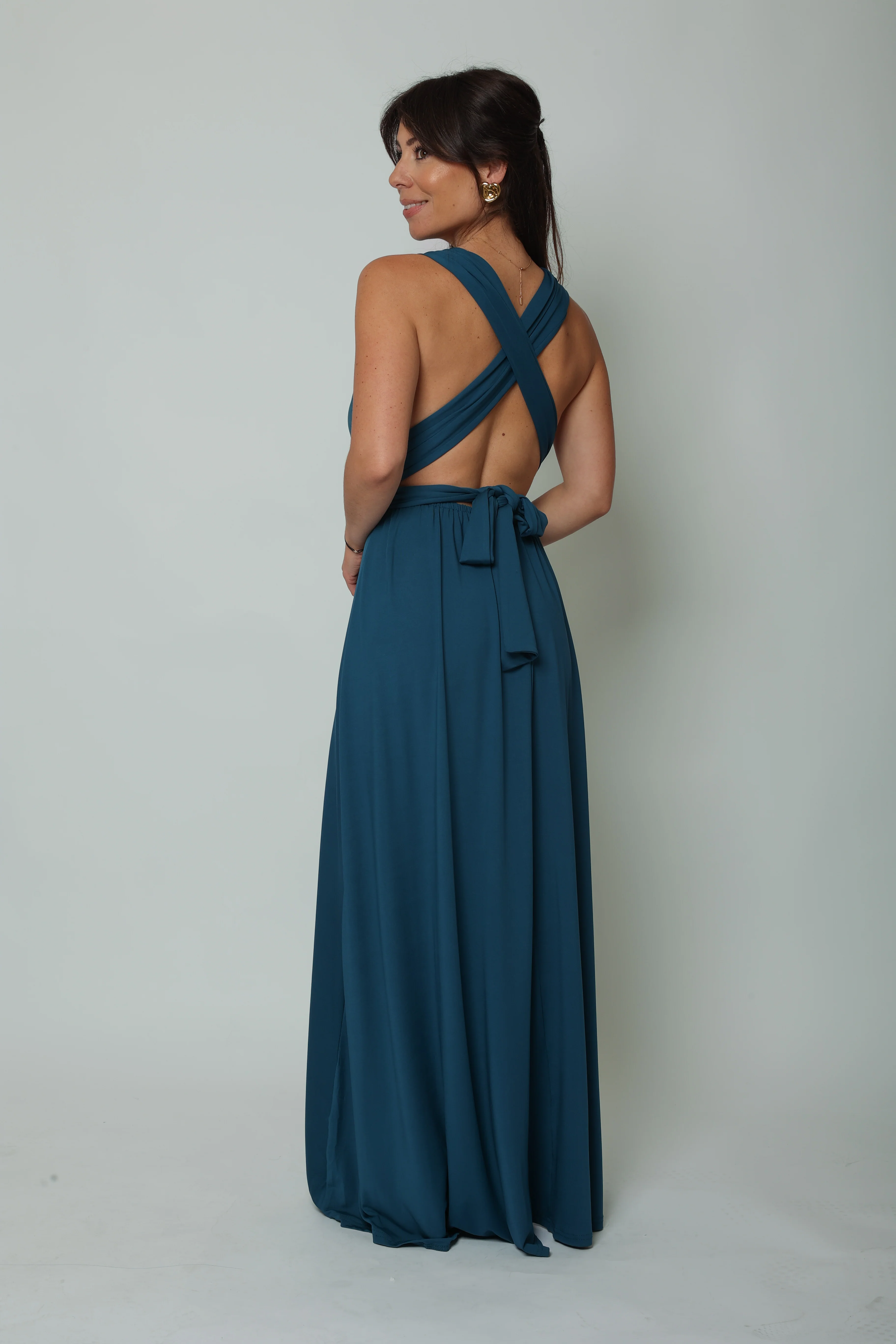 • Robe longue multi-positions bleu paon, douce et extensible « effet seconde peau », doublée et élastiquée à la taille