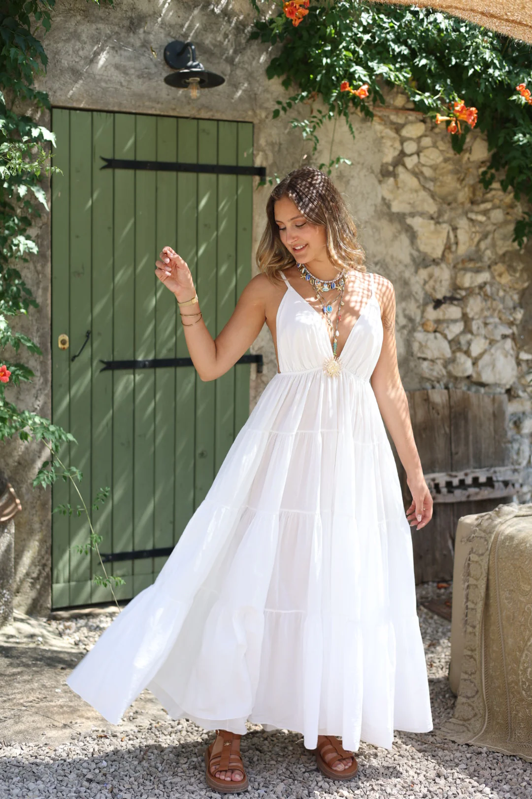 • Robe en coton blanche, avec bijoux doré